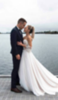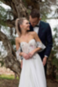 Beautiful floral lace laser-cut lace bodice and floating sleeves with a flowing chiffon skirt finished with a satin waist belt matching the chosen satin colour of the gown